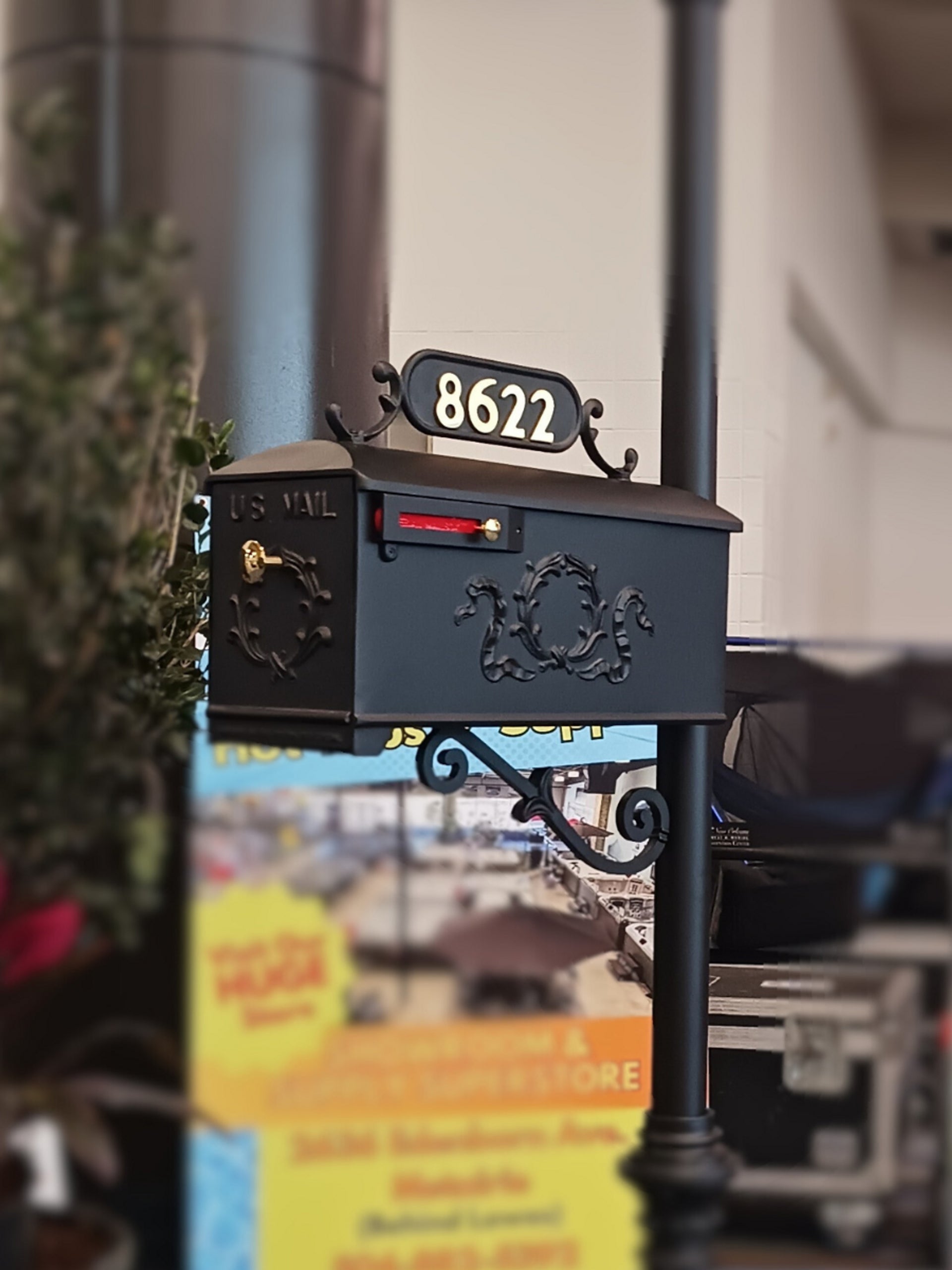 The Imperial Box #9 is a cast-aluminum mailbox with wreath designs on both sides of the box as well as the door. It includes one large brass knob or ring, a small hinge, a flag assembly and any necessary hardware. Mailbox 9 offers a versatile, festive appearance, complete with a wreath that can be interchanged with other mailboxes to match the current season. Made from high-quality cast aluminum, this mailbox features intricate detailing, making it a truly exquisite addition to any home. This is one of Imperial’s standard-sized box and the dimension are as follows: